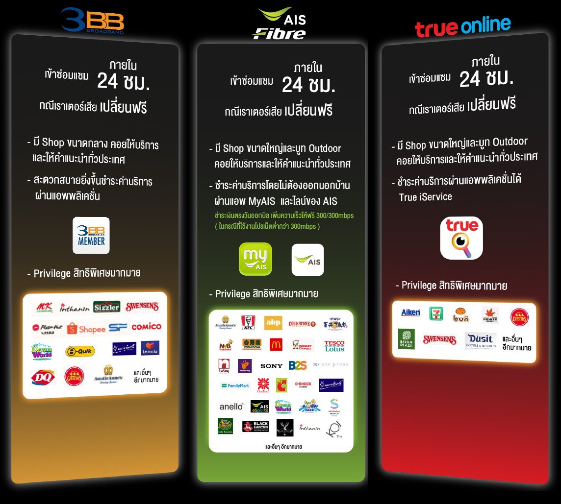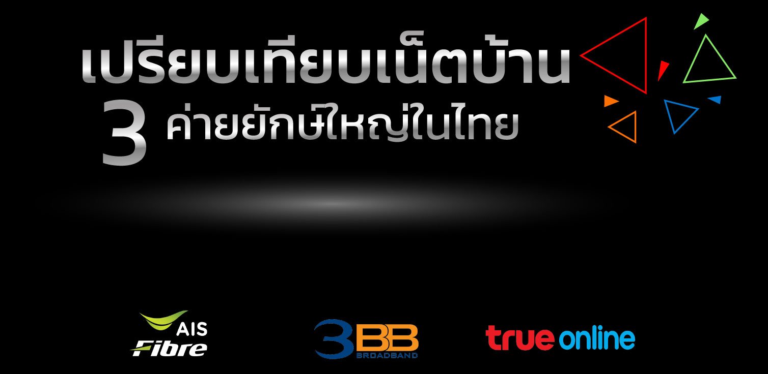 ปัจจุบันอินเตอร์เน็ตมีหลากหลายค่ายที่เปิดให้บริการไม่ว่าจะเป็น true online, 3bb, Ais Fibre เป็นต้น แล้วเราควรติดเน็ตบ้านค่ายไหนดี ค่ายไหนคุ้มกว่ากัน ? วันนี้เรามีคำตอบ ที่ช่วยให้คุณตัดสินใจเลือกติดเน็ตบ้านได้ง่ายขึ้น เราได้นำข้อมูลโปรเน็ตบ้านของ3 ค่ายยักษ์ใหญ่มาเปรียบเทียบในด้านต่างๆ และยังเปรียบเทียบเชิงลึกในเรื่องอุปกรณ์ที่ใช้ติดตั้งและบริการหลังการขาย , บริการพิเศษ เพื่อประกอบติดสินใจว่าค่ายไหนดีค่ายไหนคุ้ม แพ็คเกจของค่ายไหนน่าซื้อกว่ากันเราจะแบ่งหัวข้อการเปรียบเทียบออกเป็น 4 หัวข้อหลัก