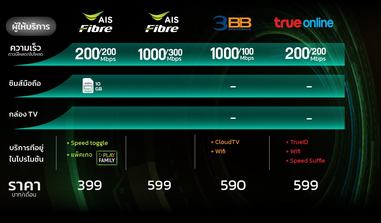 AIS FIBRE (เอไอเอส ไฟเบอร์) เน็ตบ้านราคาถูกและของแถมคุ้มๆ มีเจ้าเดียวที่ให้ได้ ณ ตอนนี้เอไอเอสจัดโปรเริ่มต้น 200/200 Mbps ที่ได้ทั้งแพ็คเกจ Play Family รวมช่องทีวีดังระดับโลก และ ซิมส์เน็ตอีก 10 GB ในราคาแค่ 399บ./ด. เท่านั้น หรือ โปรสำหรับคนที่ต้องการเน็ตแรงแต่งบน้อย AIS Fibre เค้าก็จัดมาให้กับโปร 500/500 Mbps แล้วสามารถปรับความเร็วได้สูงสุดที่ 1000/300 Mbps เลยทีเดียวในราคาแค่ 599 บ./ด. ก็ได้เน็ต 1 กิกะบิต ไปใช้แล้ว โปรแรงต้องยกให้เค้าเลยกับ Ais Fibre