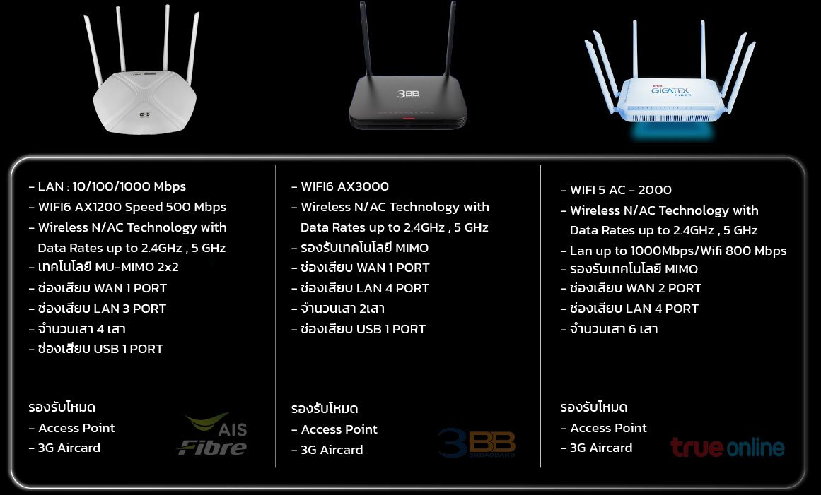 *เราเตอร์สามค่ายนี้เป็นการหยิบยกบางรุ่นมาเป็นตัวอย่างเท่านั้นเป็นรุ่นที่กำลังทำการตลาดอยู่ ณ ปัจจุบัน บางโปรโมชั่นอาจจะไม่ได้เราเตอร์รุ่นนี้