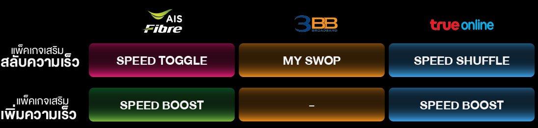 แพ็คเกจเสริมของทั้งสามค่าย (True internet, AIS Fibre, 3bb) อย่าง แพ็คเกจสลับความเร็วเป็นบริการ ฟรี! ส่วนแพ็คเกจเพิ่มความเร็วเป็นบริการที่มีค่าใช้จ่ายเพิ่มเติม